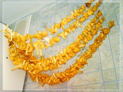 Сушат таким способом не больше двух недель. Сперва, лисички должна слегка подсушиться на газете на солнце в проветриваемом месте. Грибы нанизывают на крепкие нитки и развешивают на солнце. Они не должны плотно прилегать друг к другу.