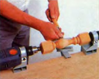 Приставка к дрели — токарный станок по дереву представлена различными моделями: наиболее простые (сверху) состоят из отдельный узлов, которые могут быть установлены (фиксируются винтовыми зажимами — тисками) не только на верстаке, но и на обычном массивном столе; более совершенные имеют общую станину (справа), на которой соосно монтируются все узлы приставки; на некоторых моделях (слева) можно одновременно вытачивать две одинаковые детали. Модели со станиной обеспечивают более высокий класс обработки деталей.